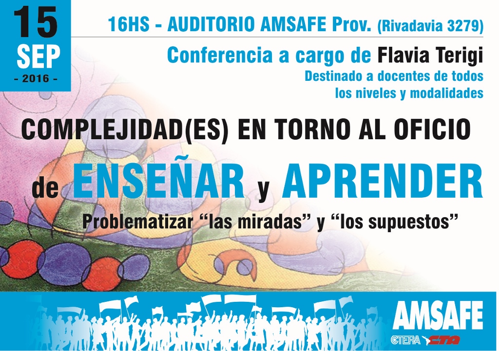 Invitamos a compañerxs de todos los niveles y modalidades a participar de esta conferencia que contará con la disertación de Flavia Terigi; el jueves 15 de setiembre a las 16 hs. en el auditorio de AMSAFE PROVINCIAL, en Rivadavia 3279 de la ciudad de Santa Fe.