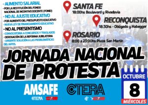 En el marco del plan de lucha de CTERA y AMSAFE, este miércoles 8 de octubre realizamos en toda la provincia la Jornada Nacional de Protesta, con clases públicas, radios abiertas y actividades junto a la comunidad educativa.