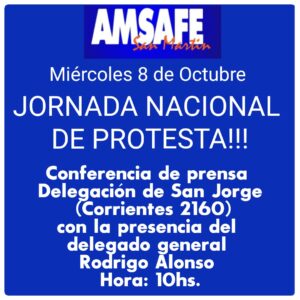 En nuestro departamento llevaremos adelante una conferencia de prensa en la delegación de San Jorge, Corrientes 2160, a las 10hs. En dicha conferencia tomaran la palabra el Secretario General de Amsafe Rodrigo Alonso y el  Delegado Seccional de Amsafe San Martín Damian Marconetto.