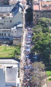 Luego de la conferencia de prensa brindada por el secretario General de AMSAFE, Rodrigo Alonso, la docencia santafesina comenzó una multitudinaria marcha por las calles de la Capital provincial, con un contundente apoyo de la comunidad, hasta arribar a la sede del Ministerio de Educación donde tuvo lugar el acto central ante más de 10.000 trabajdores y trabajadoras de la educación.