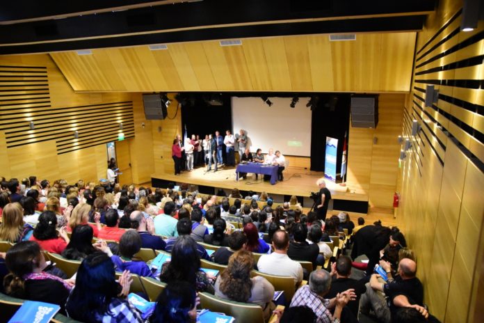 En la presentación de la actividad realizada en el Auditorio de AMSAFE Provincial, intervinieron con distintas consideraciones gremiales José Testoni y Javier Almirón, secretarios Adjunto y Gremial, respectivamente, de AMSAFE y los delegados seccionales dirigieron un saludo a los cientos de delegadxs presentes.